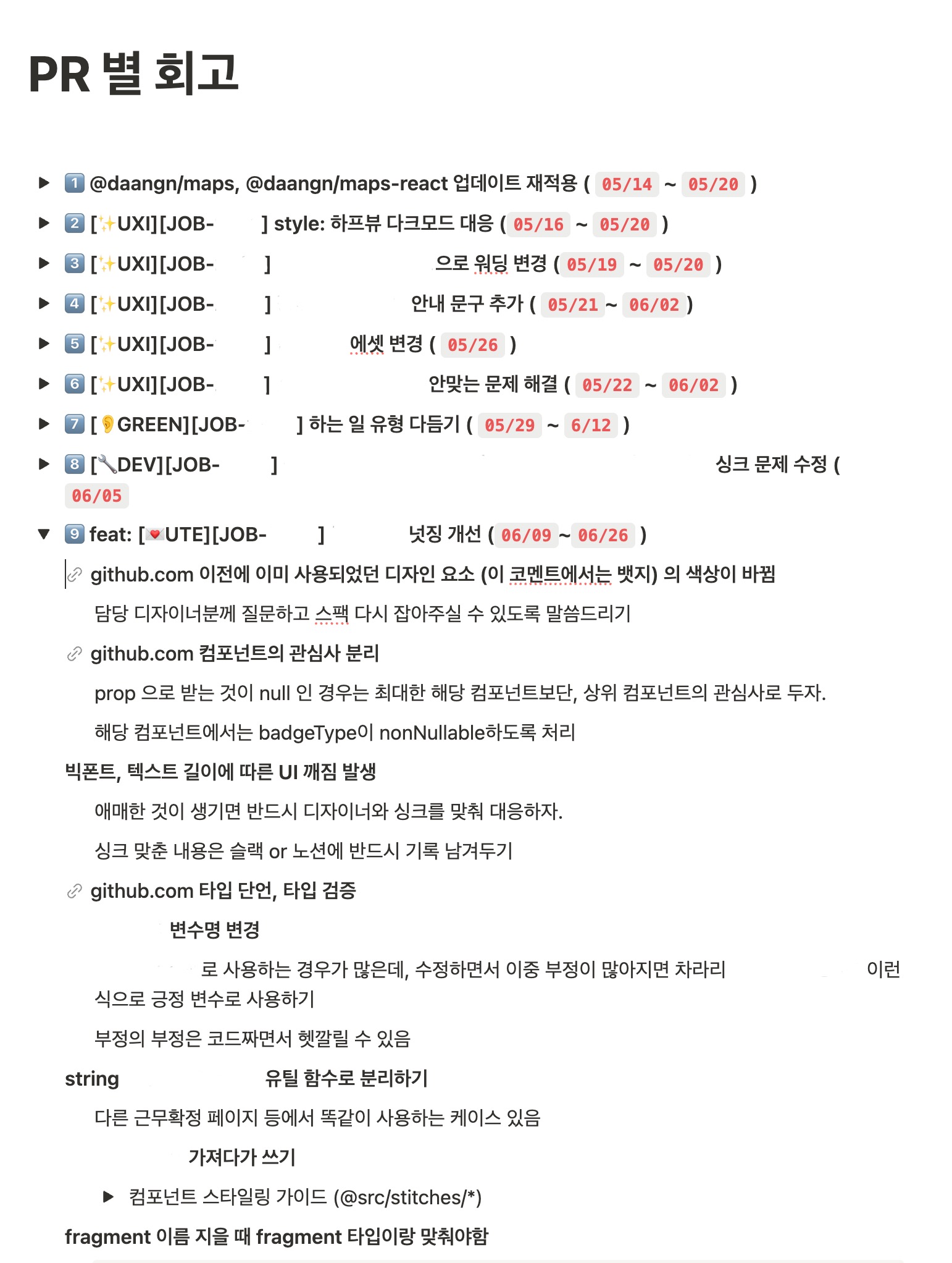 5주차에는 이전보다 더 늘어난 양의 리뷰를 받았다. 리뷰는 알바팀이 어떻게 사고하는지를 싱크할하는데에 도움을 주고, 같은 리뷰를 받는 상황을 최대한 만들지 않아야 하기 때문에, 리뷰를 적용하고 기억하는게 중요하다. 앞으로 더 리뷰가 쌓이다보면, 나중에 찾아보고 싶은 내용을 찾기 힘들 것 같아서, 받은 리뷰를 정리하기 시작했다. 최대한 한 페이지에서 복습, 검색의 용이성을 위해 싶어서 PR 별로 토글에 넣었다.