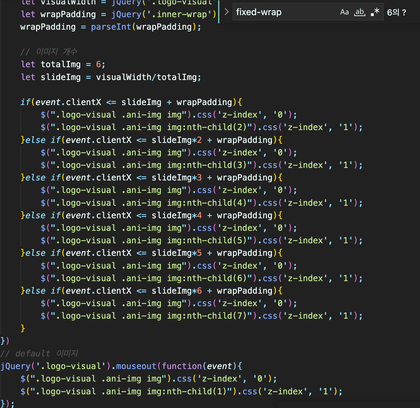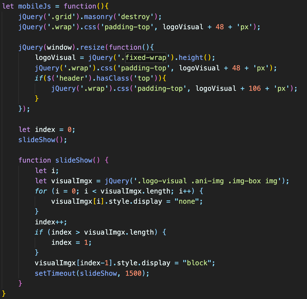 모바일은 1.5초마다 slideshow함수를 불러내 인덱스 값을 하나씩 바꿔준다. 기존에 보여지는 이미지의 display 선택자를 none으로, 새로운 인덱스 이미지의 display 선택자를 block으로 바꿔 보여지게 한다. 그리고 마지막에 주어진 이미지 인덱스 배열의 끝에 도달하면 그 값을 1로 바꾸어 준다.