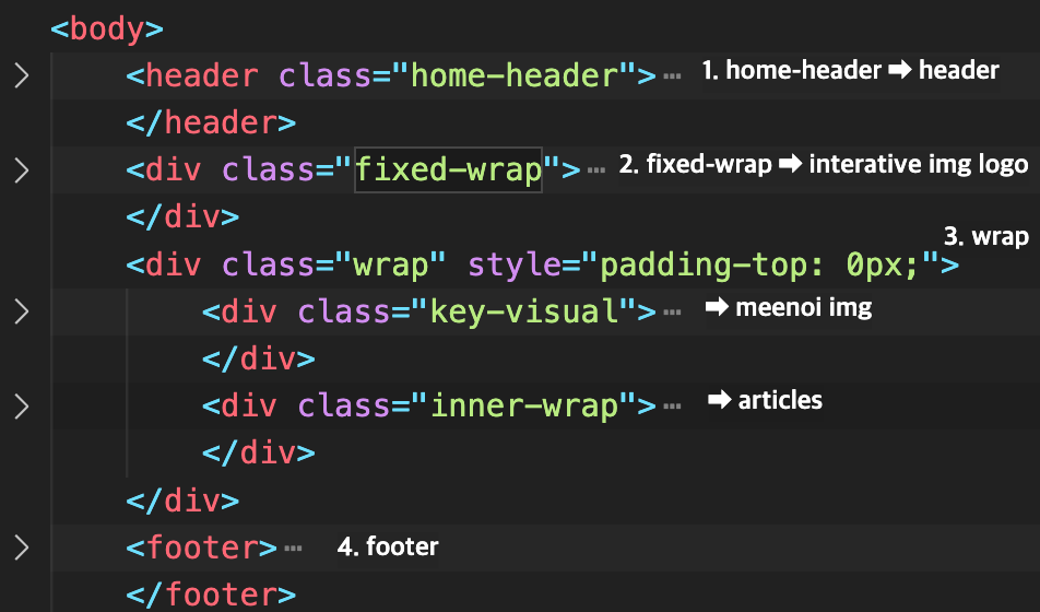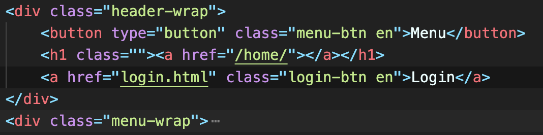 header-wrap안에는 메뉴버튼, 홈 로고, 로그인 버튼이 들어간다. 이번주까지는 spring이 아니라 vscode에서 작업중이기 때문에 우선은 페이지 이동은 파일 명을 넣어뒀다. 홈 로고는 처음에는 보이지 않다가 아래 아티클로 내려갔다가 올리면 그때 보인다. 내 추측으로는 top으로 올라가는 기능대신 넣은 것 같다.