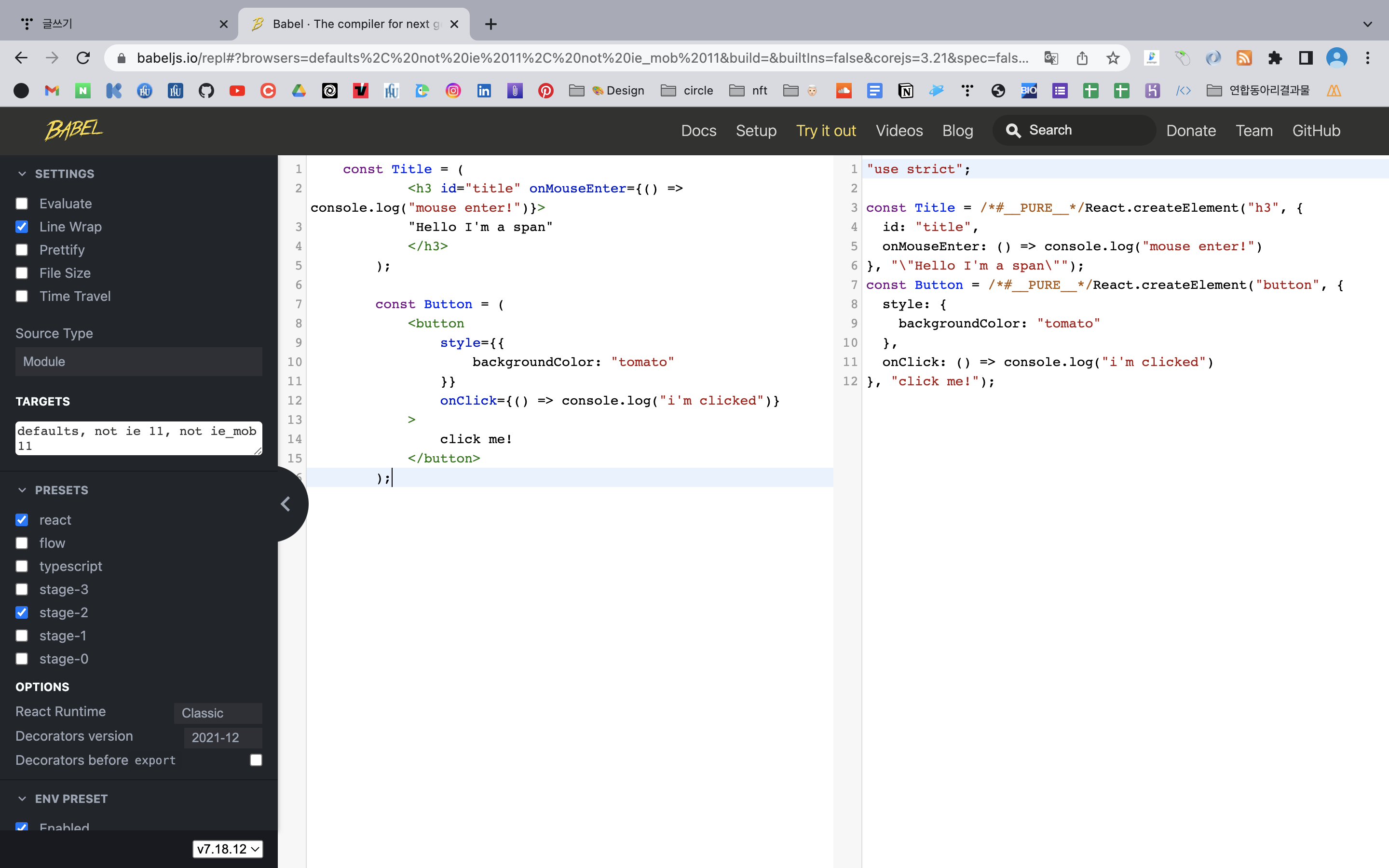 babel์ importํด์ฃผ๊ณ script ์์ type์ ์ง์ ํด์ฃผ๋ฉด ์ด๋ ๊ฒ ์ ๋จ๋ ๊ฒ์ ํ์ธํ ์ ์๋ค.