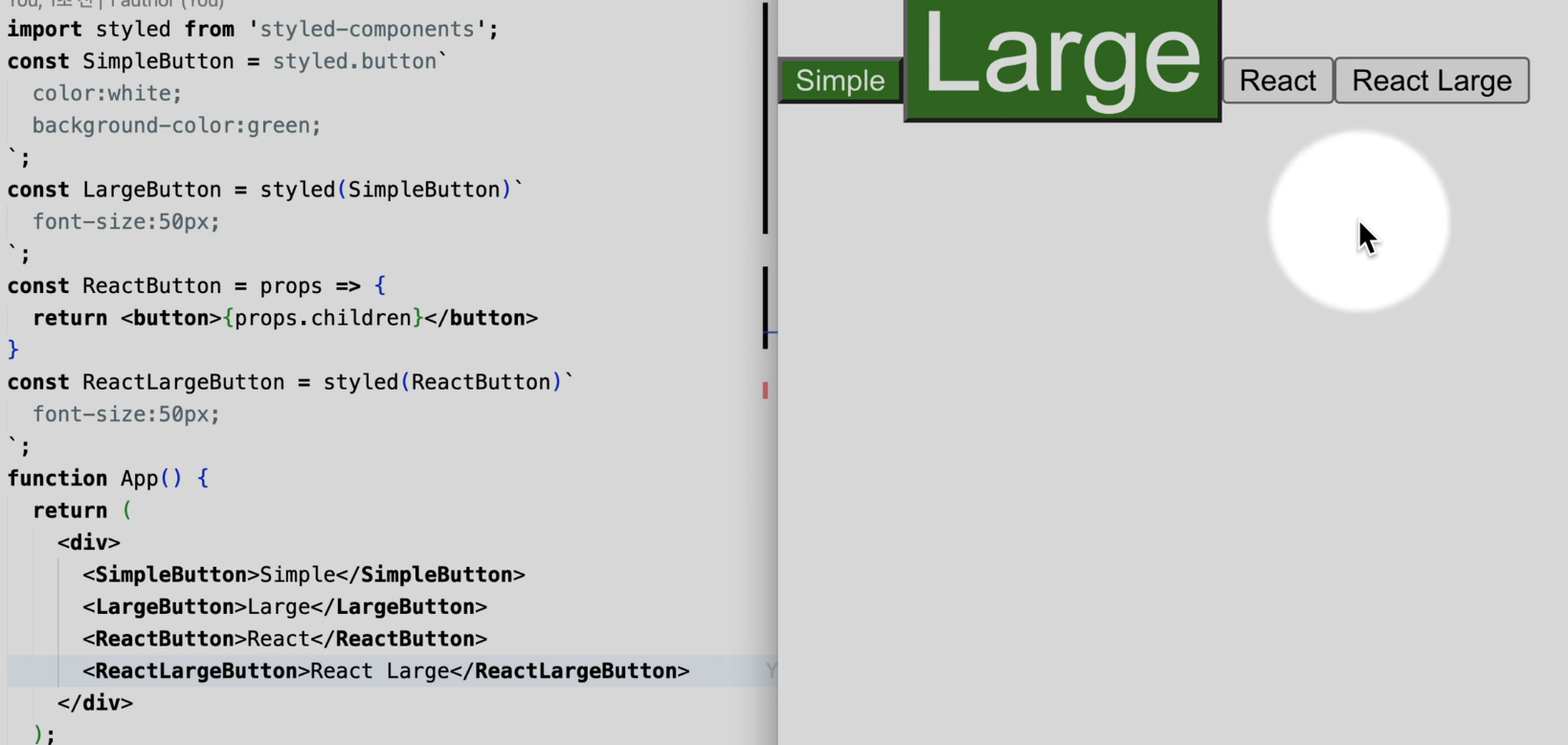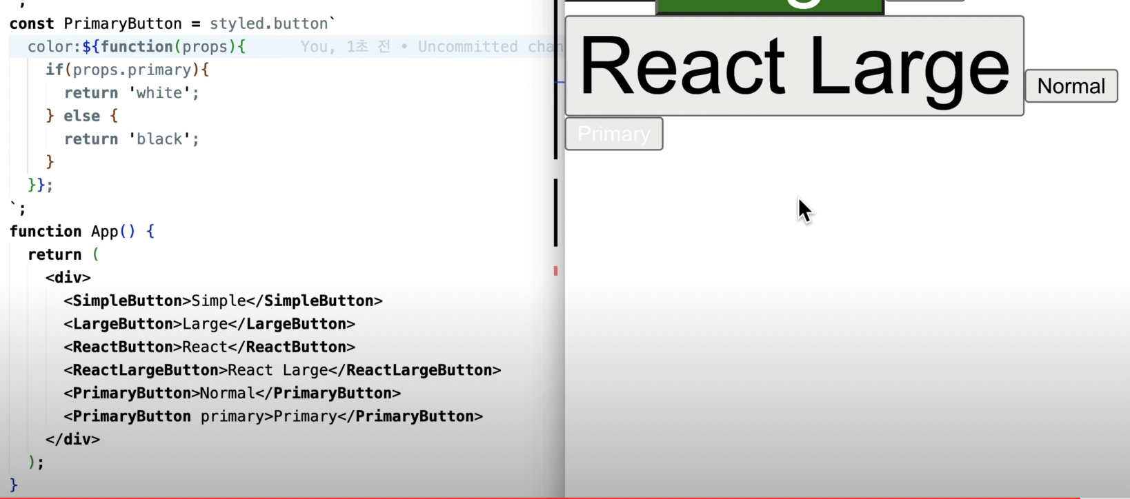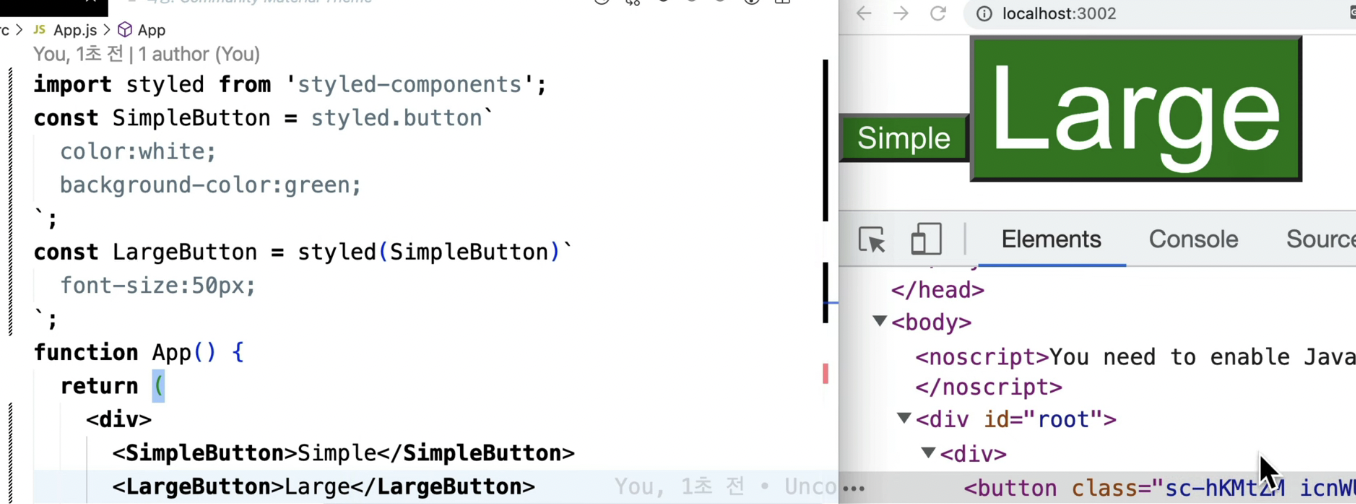 - 오른쪽에서 styled-component를 살펴보면, styled-components를 import하고 styled를 가져온 다음에 styled.botton과 백틱을 활용해서 함수를 호출해주고 버튼을 최상위로 하는 컴포넌트를 만들어준다.
