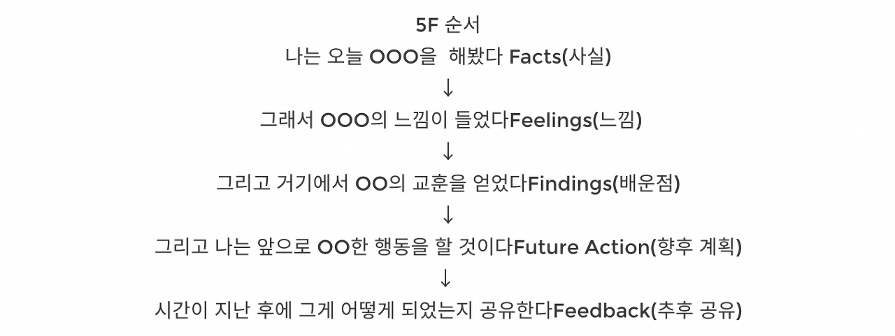 특히 5F는 개인이 한 활동을 회고하는 데 유용한데요, 어떤 일이 있었고 무엇을 느꼈는지를 시간 순서대로 정리하는 데 도움이 되는 방식이에요.