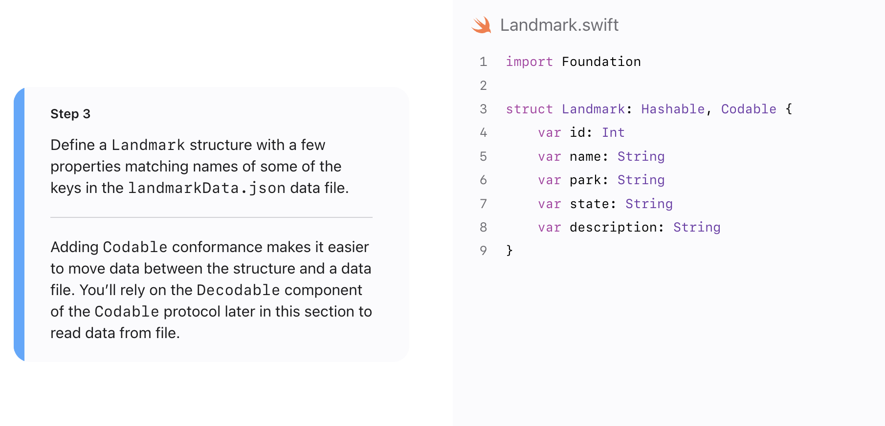 Codable 프로토콜은 객체를 다른 데이터 형식으로 변환하고, 다시 해당 형식에서 객체로 변환하는 데 사용된다. 즉, Codable을 준수하는 객체는 데이터를 직렬화(Serialization)하고, 역직렬화(Deserialization)할 수 있다. 이는 객체를 JSON, XML, Property List 등과 같은 외부 데이터 형식으로 변환하거나, 외부 데이터를 객체로 변환할 때 유용하다. Codable을 사용하면 객체를 인코딩(Encoding)하거나 디코딩(Decoding)하는 작업을 간편하게 수행할 수 있다. Landmark 구조체는 Codable 프로토콜을 준수하므로, 이 객체를 JSON 데이터로 인코딩하거나 JSON 데이터에서 디코딩할 수 있다.