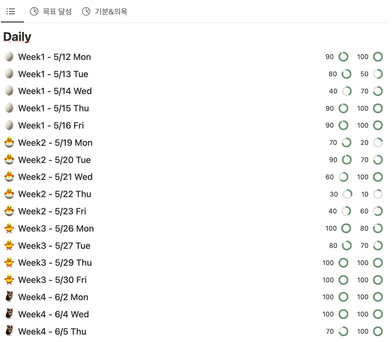 일주일 단위로 묶어야 내가 어떻게 변화하고 있는지 조금 더 극명하게 보이지 않을까 싶어서다.
