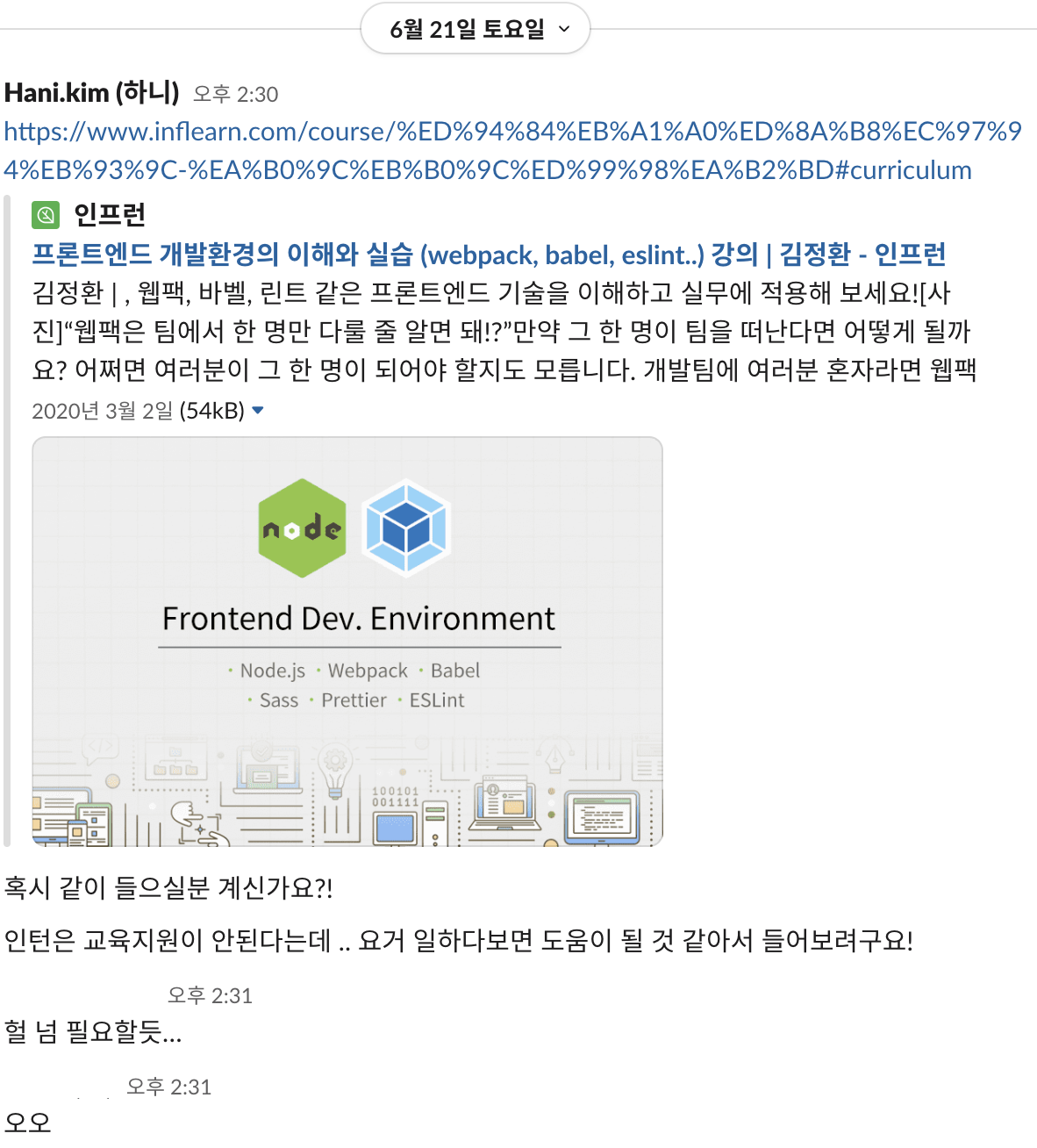 webpack, babel, eslint 등 타입스크립트나 리액트만 중요한게 아니라 개발 환경을 잘 아는게 중요하다는 것을 이번 마이그레이션 테스크 하며 느꼈다. 그래서 프론트엔드 동기분들과 같이 강의를 끊었다. 확실히 이 내용의 중요성을 알고 찾아 들으니 더 학습에 기대감이 생기는 것 같다.