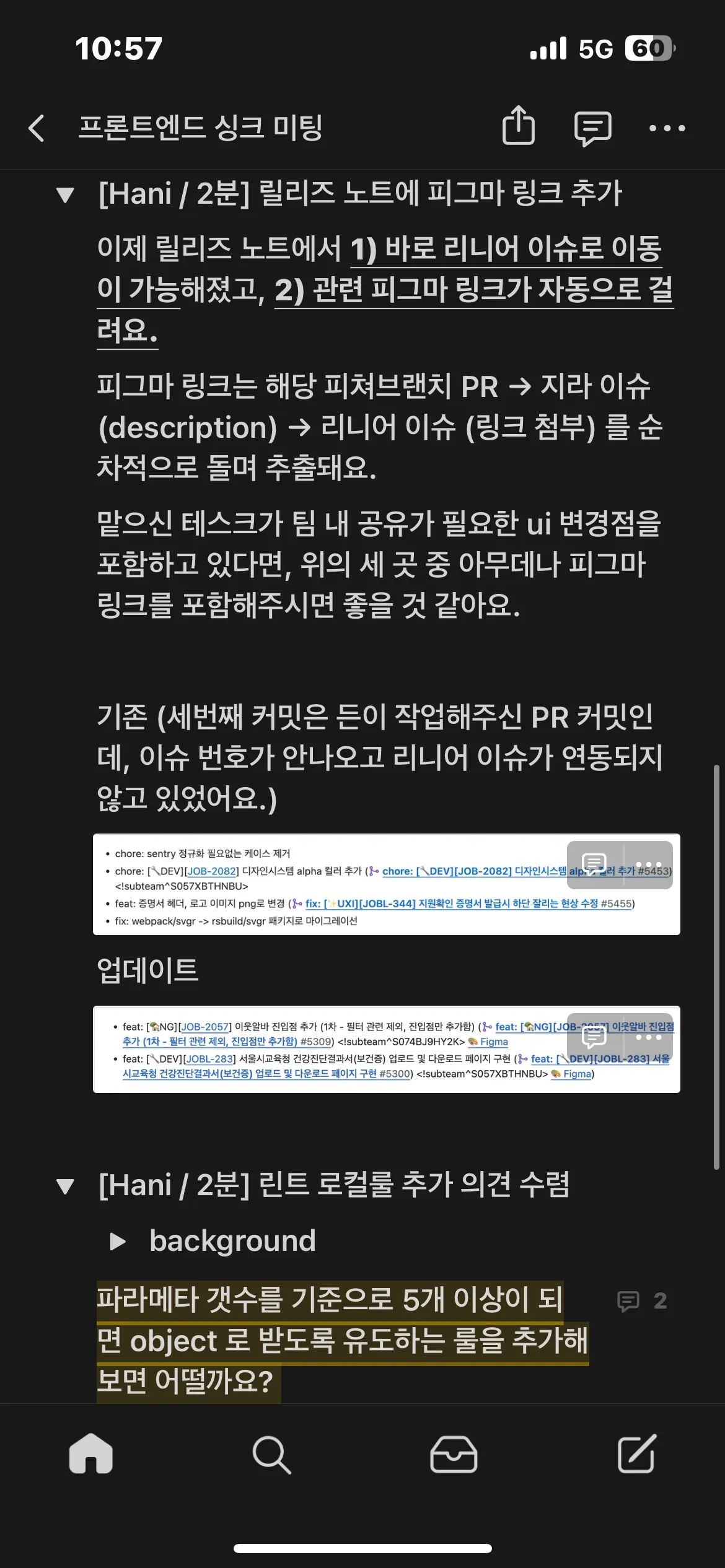 이번 주에는 용기 내어 린트 룰 추가를 제안했고, 프론트엔드 싱크 미팅 안건으로 직접 올렸다. 점진적으로 5개부터 적용하는 걸로 합의가 되었고, 하루 만에 적용 PR도 올렸다. 처음 인턴 때 인턴선배님이 린트 룰을 추가했던 걸 보고 놀랐었는데, 이제는 내가 팀에 기여할 수 있다는 게 새삼 신기하기도 했다.